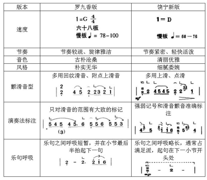 罗九香先生多采用回纹滑音和附点上滑音相结合,具有“缓而不怠,紧则有序”之特点,音乐古朴淡雅,而饶宁新先生却多用上滑与点滑并结合缓慢的揉按弦,把莲花的“傲气”充分表现出来。最后,经过提炼总结,我得出两个版本不同角度比较一览表